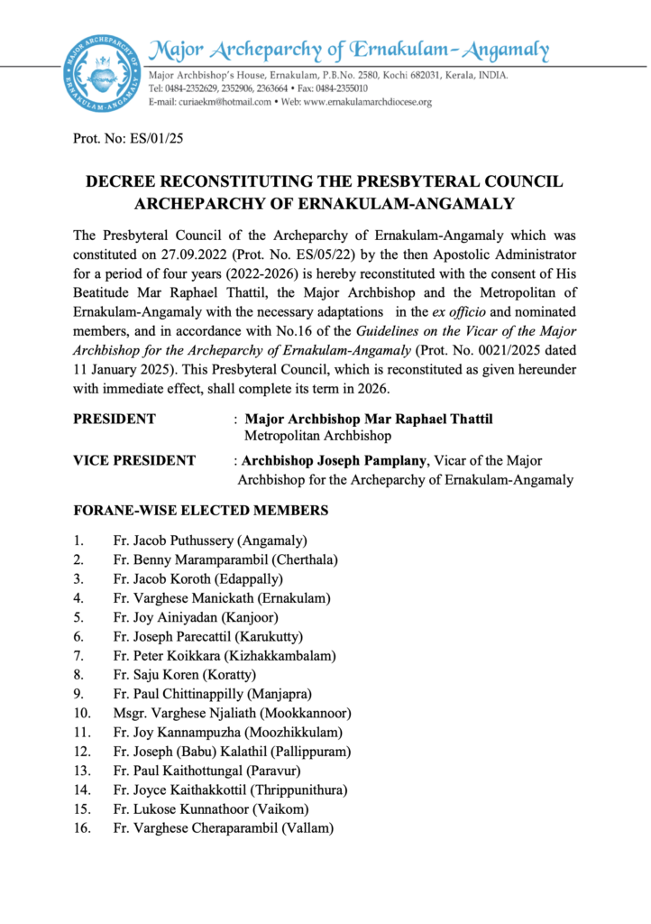 ആർച്ചുബിഷപ് ജോസഫ് പാമ്പ്ളനി 21 വൈദികരുമായി നടത്തിയ ചർച്ചയിൽ വാക്ക് പറഞ്ഞതനുസരിച്ചു കാനോനിക സമിതികളെല്ലാം പുനർസ്ഥാപിക്കും എന്നതാണ്. അതിൽ ഒന്നായ, നിലവിലിരുന്ന പ്രേസബിട്രൽ കൌൺസിൽ പുനർസ്ഥാപിച്ചു. 27-09-2022 സ്ഥാപിച്ച പ്രേസബിട്രൽ കൗൺസിലിനു 2026 വരെയാണ് കാലാവധി ഉള്ളത്. ഈ സ്ഥാപിച്ച കൗൺസിലിന്റെ ആദ്യ സെഷൻ വിളിച്ചതിൽ, ഉന്നയിച്ച ചോദ്യങ്ങൾക്കു ഉത്തരമില്ലാതെ മാർ ആന്ധ്രുസ് താഴ്ത്ത് മീറ്റിംഗ് അവസാനിപ്പിക്കാതെ ഇറങ്ങിപോകുകയായിരുന്നു. അതിനുശേഷം എഴുതി ആവശ്യപ്പെട്ടിട്ടും അദ്ദേഹം നിയമവിരുദ്ധമായി പ്രേസബിറ്റാരാൾ കൌൺസിൽ വിളിക്കാത്തിരുന്നു. പിന്നീടുവന്ന വന്ന മാർ ബോസ്കോ പുത്തുരും ഒരു വർഷം വരെ കൌൺസിൽ വിളിക്കാതെ നീട്ടി, ഒരു വർഷത്തിനകം വിളിക്കുമെന്ന് പറഞ്ഞേങ്കിലും വിളിച്ചില്ല. ഒരു വർഷം കഴിഞ്ഞപ്പോൾ അദ്ദേഹത്തിന് പരാതി നൽകിയെങ്കിലും,മെത്രാൻ നിയമവിരുദ്ധമായി കൌൺസിൽ വിളിക്കാതെ ഉത്തരവാദിത്തത്തിൽ വീഴ്ച്ച വരുത്തി. തുടർന്ന് മാർ ബോസ്കോ പുത്തൂർ രാജി വെക്കുകയും ചെയ്തു. ഈ വെള്ളിയാഴ്ചയാണ് പ്രേസബിട്രൽ കൌൺസിൽ യോഗം വിളിക്കുവാനായി കൌൺസിൽ സെക്രെട്ടറി കുര്യാക്കോസ് മുണ്ടാടാൻ അച്ചനോട് മാർ ജോസഫ് പാമ്പ്ളനി ആവശ്യപ്പെട്ടിരിക്കുന്നത്. പ്രേസബിട്രൽ കൌൺസിൽ പ്രസിഡന്റ് എന്നാ നിലയിൽ മേജർ അർച്ഭിഷോപ് മാർ റാഫൽ തട്ടിൽ പ്രസ്തുത മീറ്റിംഗിൽ പങ്കെടുക്കും. ബിഷപ്പ് പാമ്പ്ളനി വാക്ക് പറഞ്ഞതനുസരിച് പുതിയ കുരിയയെ നിയമിച്ചിട്ടില്ല. ഈ വാക്ക് പാലിക്കാൻ ഇനി ഏതാനം മണിക്കൂറുകൾ മാത്രമാണ് അവശേഷിക്കുന്നത്. ഈ പ്രർസബിട്രൽ സമിതിയിൽ ex officio members ആയി കൂരിയാ അംഗങ്ങൾ ഉണ്ട്. ഈ കൂരിയാ അംഗങ്ങളെ പൂർണമായും അവിടെനിന്നു നീക്കം ചെയ്യണം എന്ന് പറഞ്ഞു നടന്ന സമരത്തിൽ ആണ് ഈ കൂരിയായിലുള്ള ആരെയും പുതിയ കൂരിയയിൽ ഉൾപ്പെടുത്തുവാൻ തനിക്ക് ആഗ്രഹമില്ല എന്നും അവരെയെല്ലാം മാറ്റികൊള്ളാമെന്നും, പുതിയ കൂരിയയെ നിയമിക്കുമെന്നും മാർ ജോസഫ് പാമ്പ്ളനി വാക്ക് പറയുകയും എഴുതി നൽകുകയും ചെയ്തത്. മേജർ അർച്ഭിഷോപ്പിന്റെ പകരക്കാരൻ എന്നാ നിലയിൽ മാർ ജോസഫ് പാമ്പ്ളനി നൽകിയ വാക്ക് പാലിക്കാൻ മേജർ അർച്ചുഭിഷോപ്പും ബാധ്യസ്ഥനാണ്. അദ്ദേഹവും മാർ ജോസഫ് പാമ്പ്ലാനിയും വാക്ക് പാലിക്കും എന്ന് പ്രതീക്ഷിക്കുന്നു. പുതിയ കൂരിയാ നിയമിക്കുന്നപക്ഷം പ്രേസബിട്രൽ കൗൺസിലിൽ ex officio members മാറുകയും പുതിയ ഓഫീസിൽ അംഗങ്ങൾ ആകുന്നവർ പ്രേസബിട്രൽ കൌൺസിൽ അംഗങ്ങൾ ആയി മാറുക. അതുകൊണ്ട് ഏതാനം മണിക്കൂറുകൾക്കകം പുതിയ കൂരിയയെ നിയമിക്കുകയും, അവർ ആരായിരിക്കും ഈ വരുന്ന വെള്ളിയാഴാചയിലെ മീറ്റിംഗിൽ പങ്കെടുക്കുക എന്ന് പ്രതീക്ഷിക്കുന്നു. മേജർ അർച്ചുഭിഷോപിനുവേണ്ടി, വികാരി മാർ ജോസഫ് പാമ്പ്ലാനിയുടെ വാക്ക് മേജർ അർച്ചുഭിഷോപ്പിന്റേതുമാണ്, ഈ വാക്ക് പ